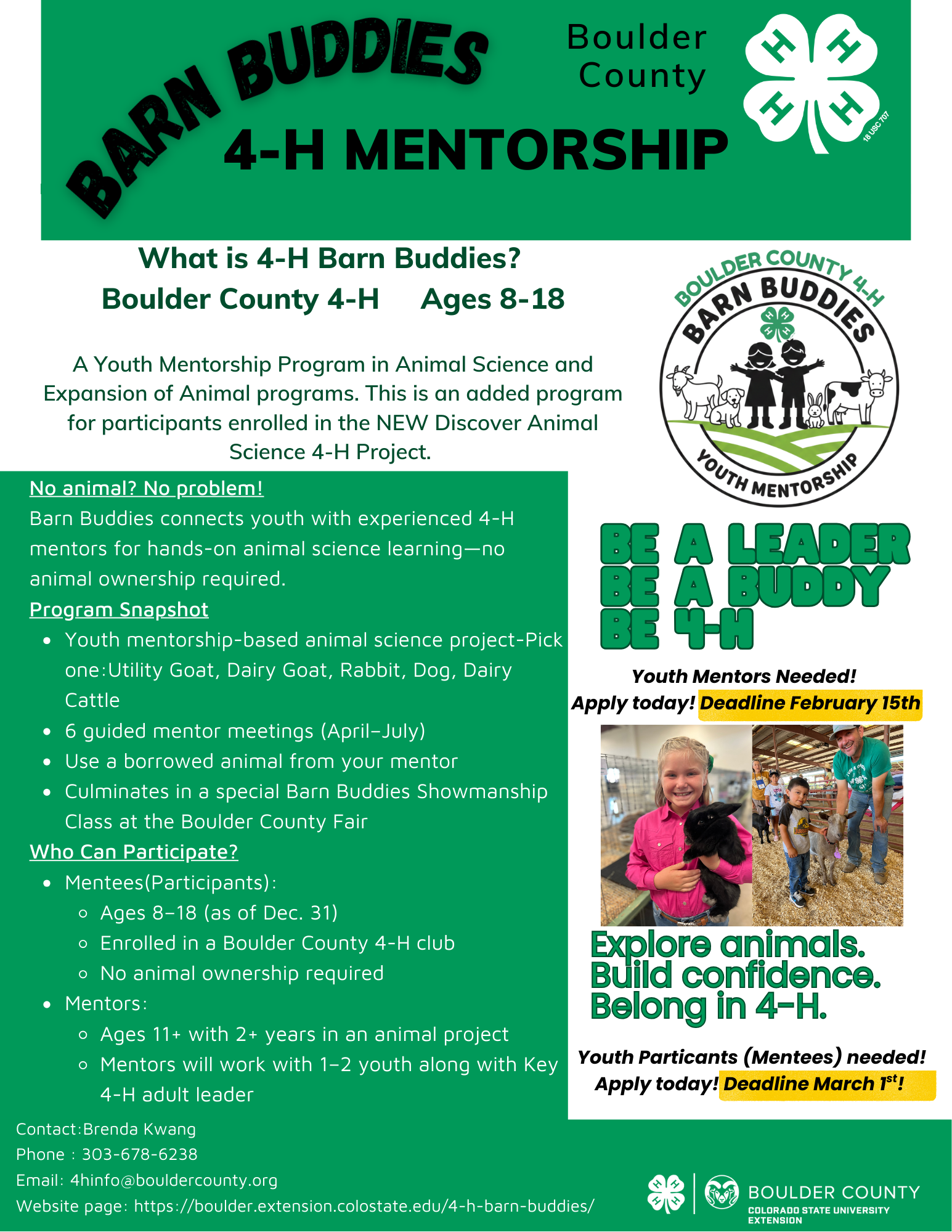 Contact Information: Brenda Kwang Phone: 303-678-6238 Email: 4hinfo@bouldercounty.org
