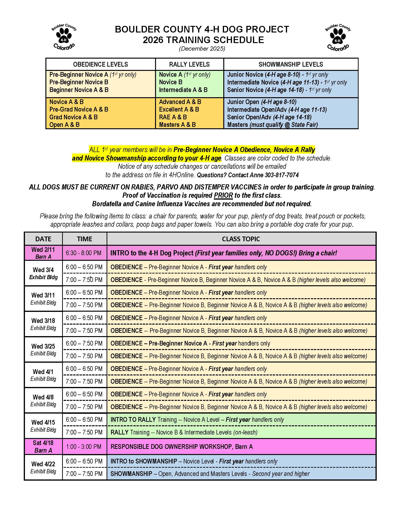 | RECORD BOOKS/E-RECORDS: 4-H Record Books are also called e-Records. Each project has its own record book that members are required to complete each year. Record books have a few times to be checked on progress throughout the year: 1. June- your 4-H leader will be sure your books are started and up to date. 2. Prior to showing at the Boulder County Fair, your record books will be checked by your superintendent to be sure they are up to date and complete as can be in order to participate and show at the fair. 3. Dogs will use the Dog Record Book. Final Dog record books are due to be received at the extension office by the last Thursday in September. (please note: your 4-H Leader may need an earlier deadline for review and signatures.) |